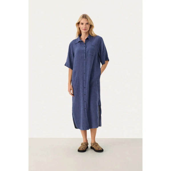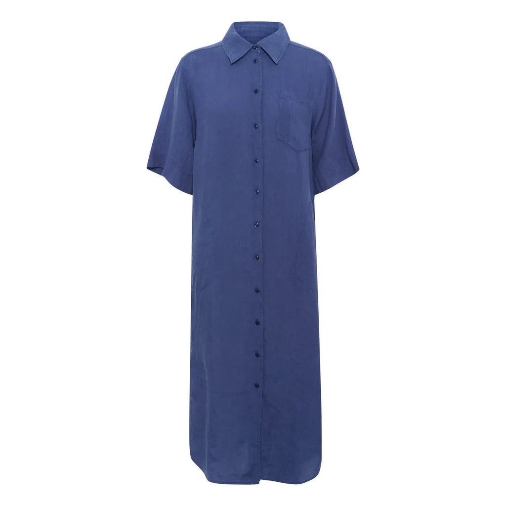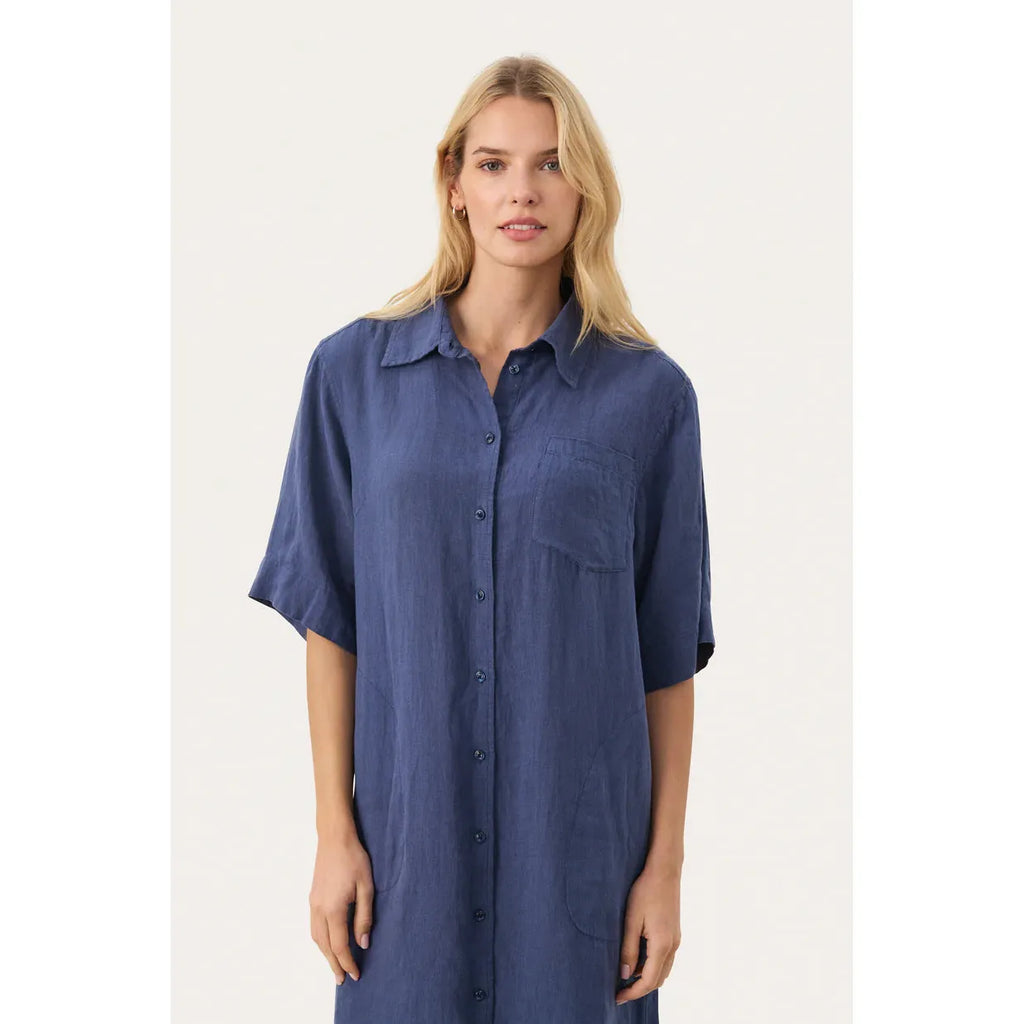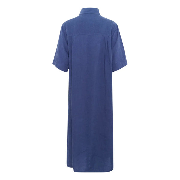This timeless shirt dress in a light linen blend is perfect for both casual and elegant looks. It features a relaxed fit, classic collar, and short sleeves for an effortless expression. Style it with sandals on warm days or with sneakers for a casual touch.