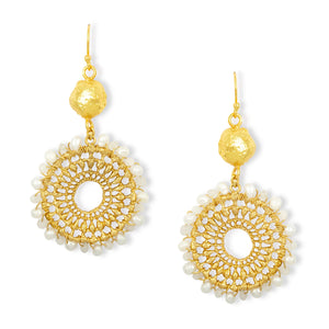Sunburst charm earrings with gemstone beads and gold ball, exquisitely handcrafted to capture attention.