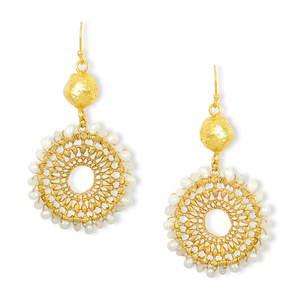 Featuring 22 carat gold-plated brass, these 6 cm earrings gracefully dangle, offering a blend of sophistication with their freshwater pearl, moonstone, and crystal beads.