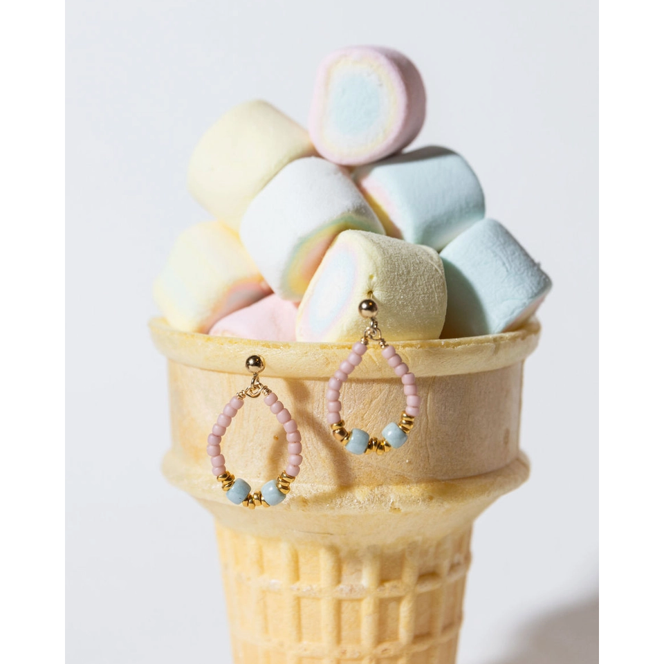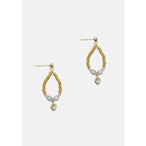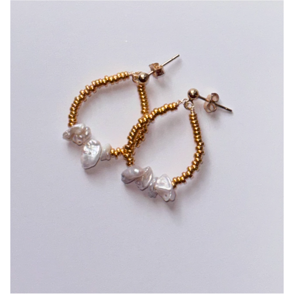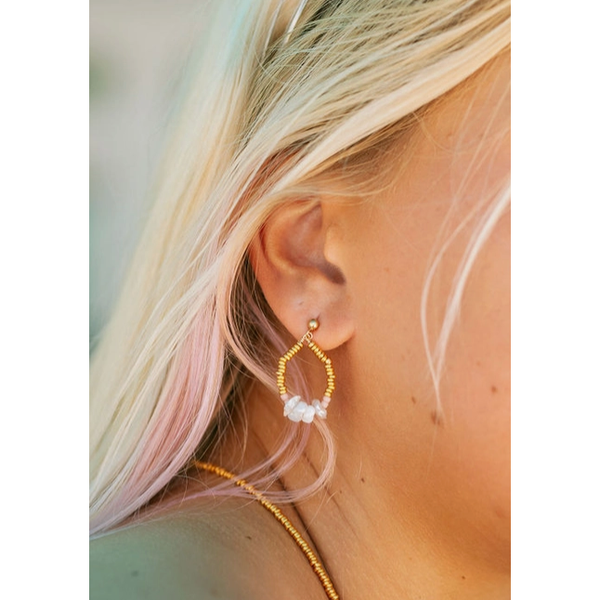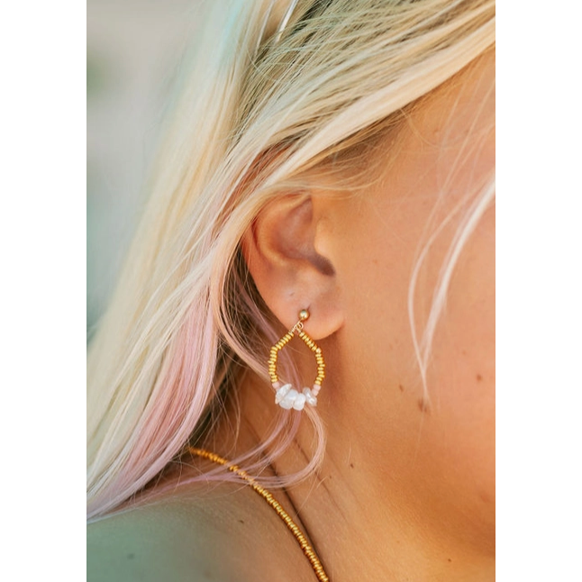 Lagoon earrings with golden shell pendants, pink crystals, cultured pearls and glass beads.