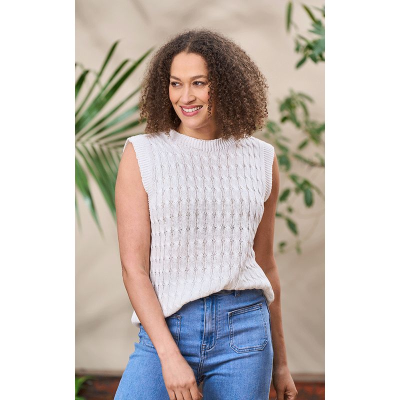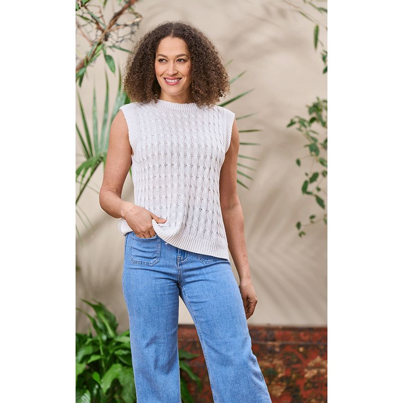 The Fowey Cable Knit Tank combines classic cotton comfort with playful texture in ivory. Layer it over our cotton shirts, or solo in warmer days. Style it with jeans and skirts — a versatile piece that brings warmth and personality to every look.