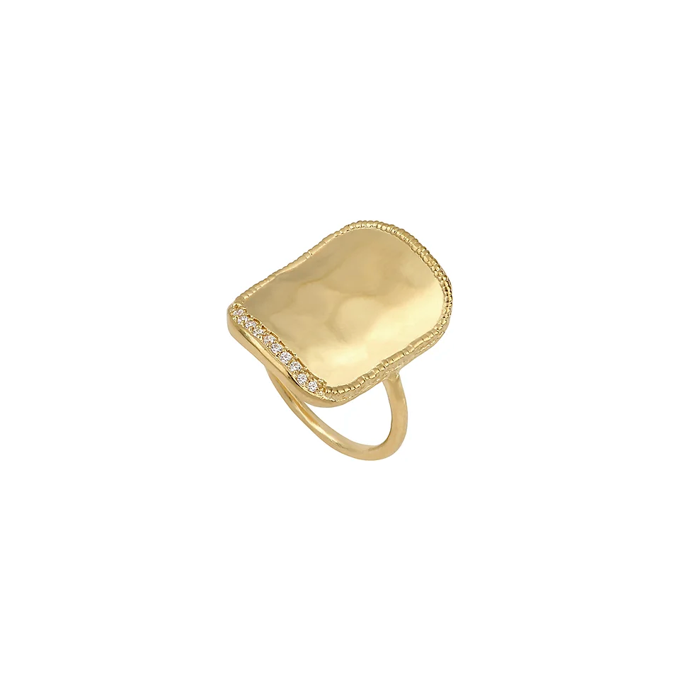 A stunning ring made from brass, gold plated with zirconia stones at one end. The ring fits comfortably on the finger, a simple but a statement ring.
