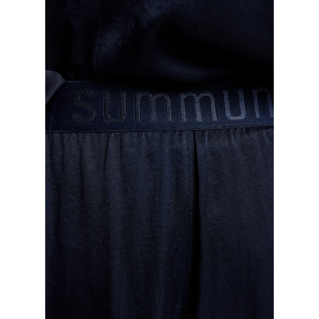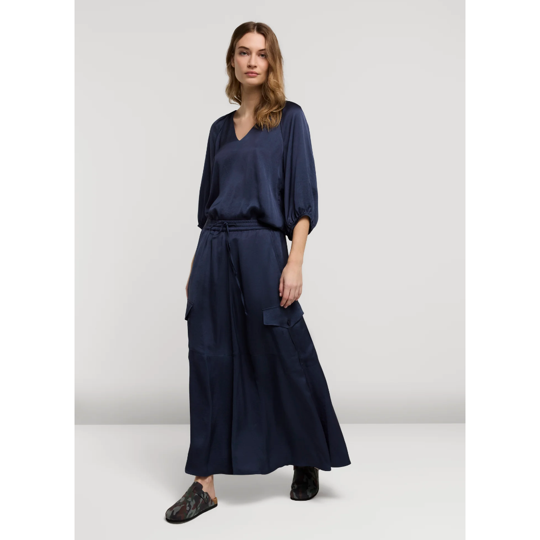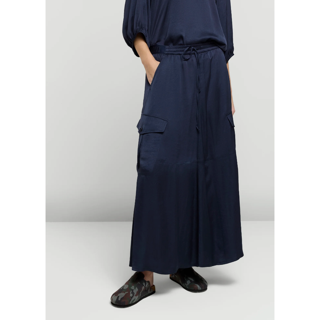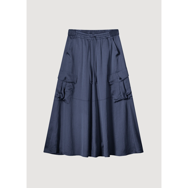 Silky touch cargo skirt made from a shiny satin fabric. The skirt has a waistband with drawstring and Summum signature elastic at the back.