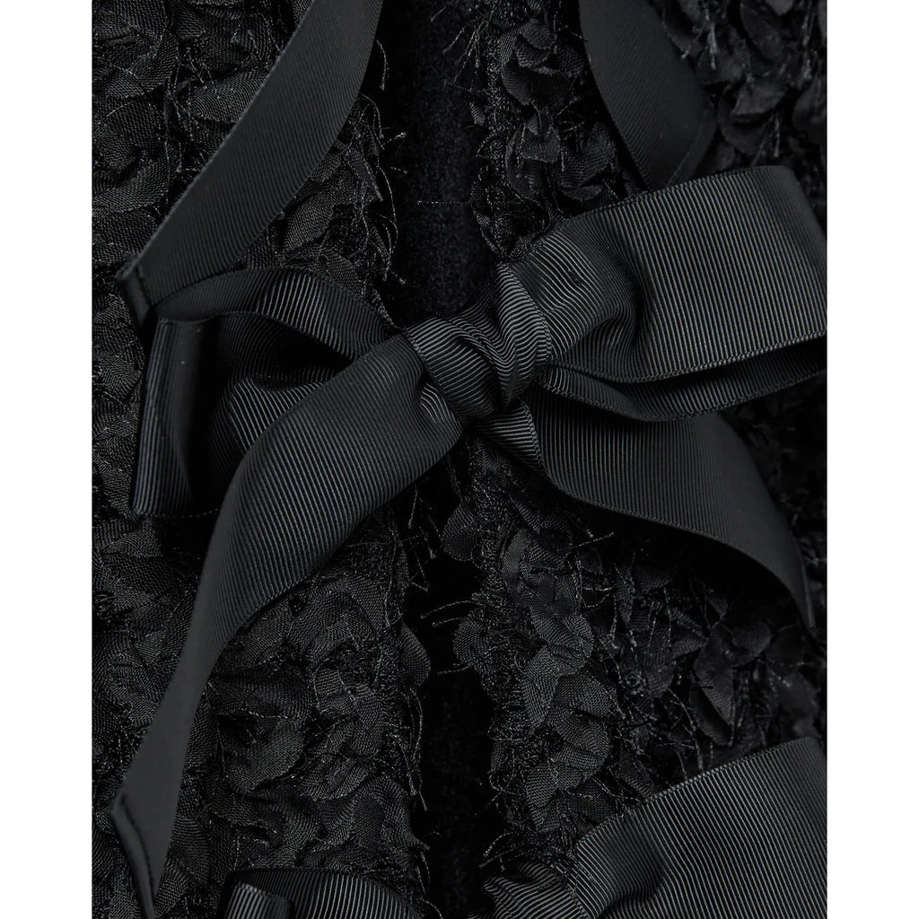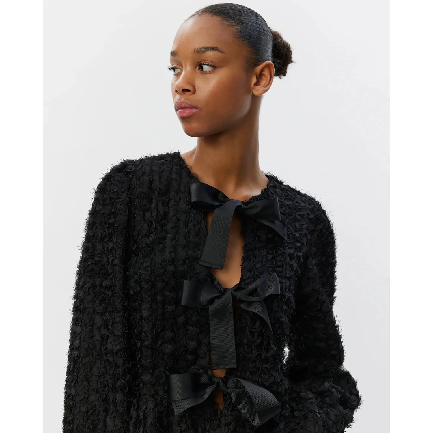 • It closes in the front with fine bows that add a feminine touch to the blouse's design.