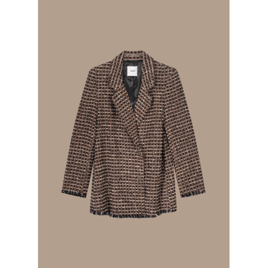 Half-length jacket with classic lapel collar and a double row of buttons. This jacket is made from a polyester-wool blend in chequered tweed.