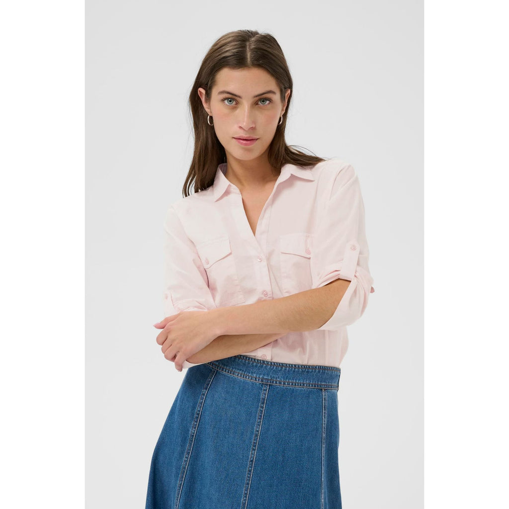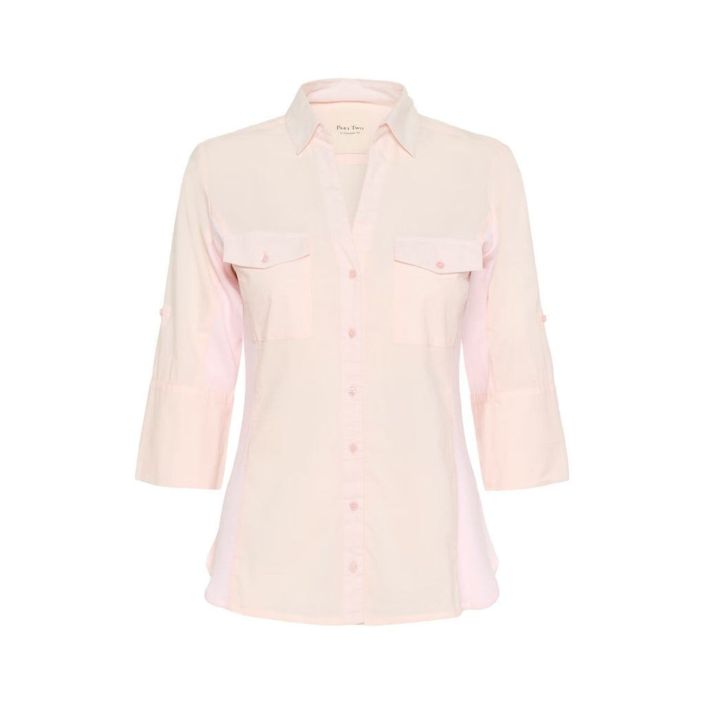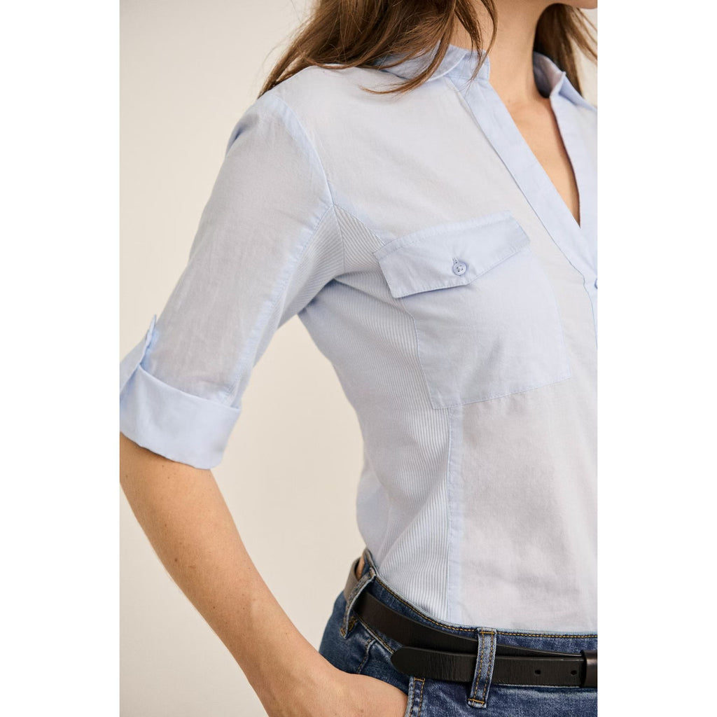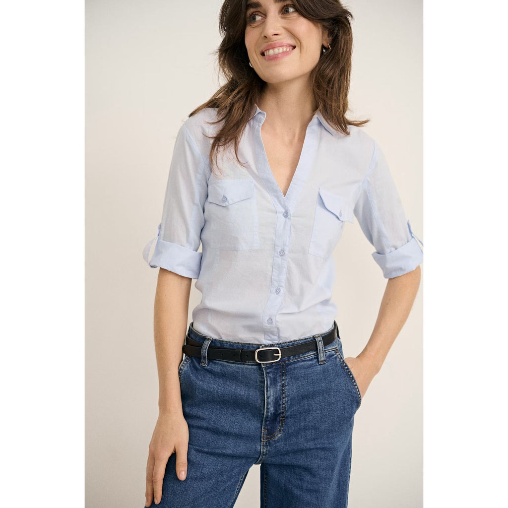 This lightweight cotton shirt features a classic cut with chest pockets and 3/4-length sleeves that can be rolled up and secured. The feminine fit and soft light blue shade or the baby pink shade make it ideal for both work and casual days. Style it with jeans or a skirt for a relaxed look.