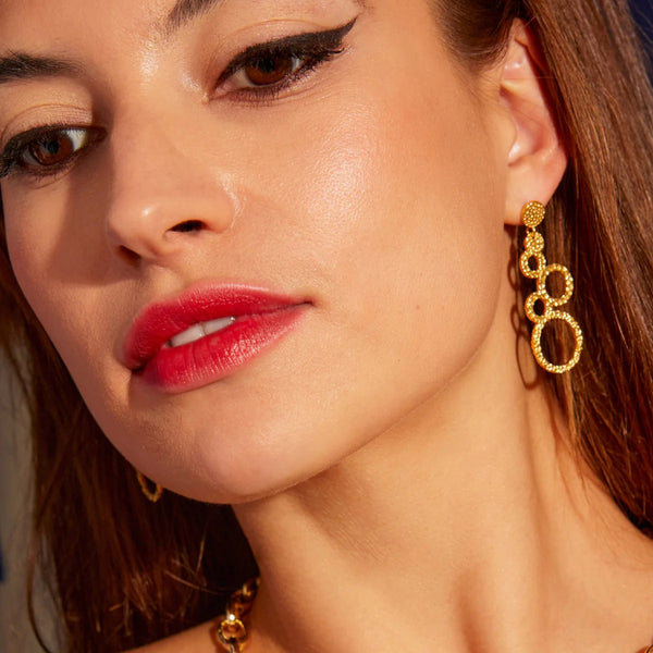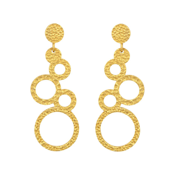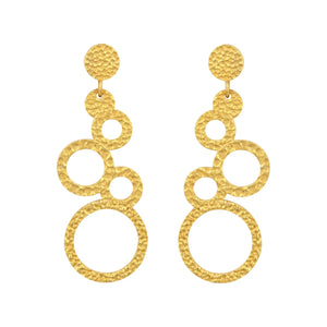 The Spiaggia is a collection of cascading circular rings that take a fluid form. Moltened together and expertly textured by hand this is a timeless piece that will suit everyone. The beaten stud coin sits comfortably on the earlobe and allows the molten rings to cascade down and catch the light with every movement. This piece will work hard for your wardbrobe year after year.