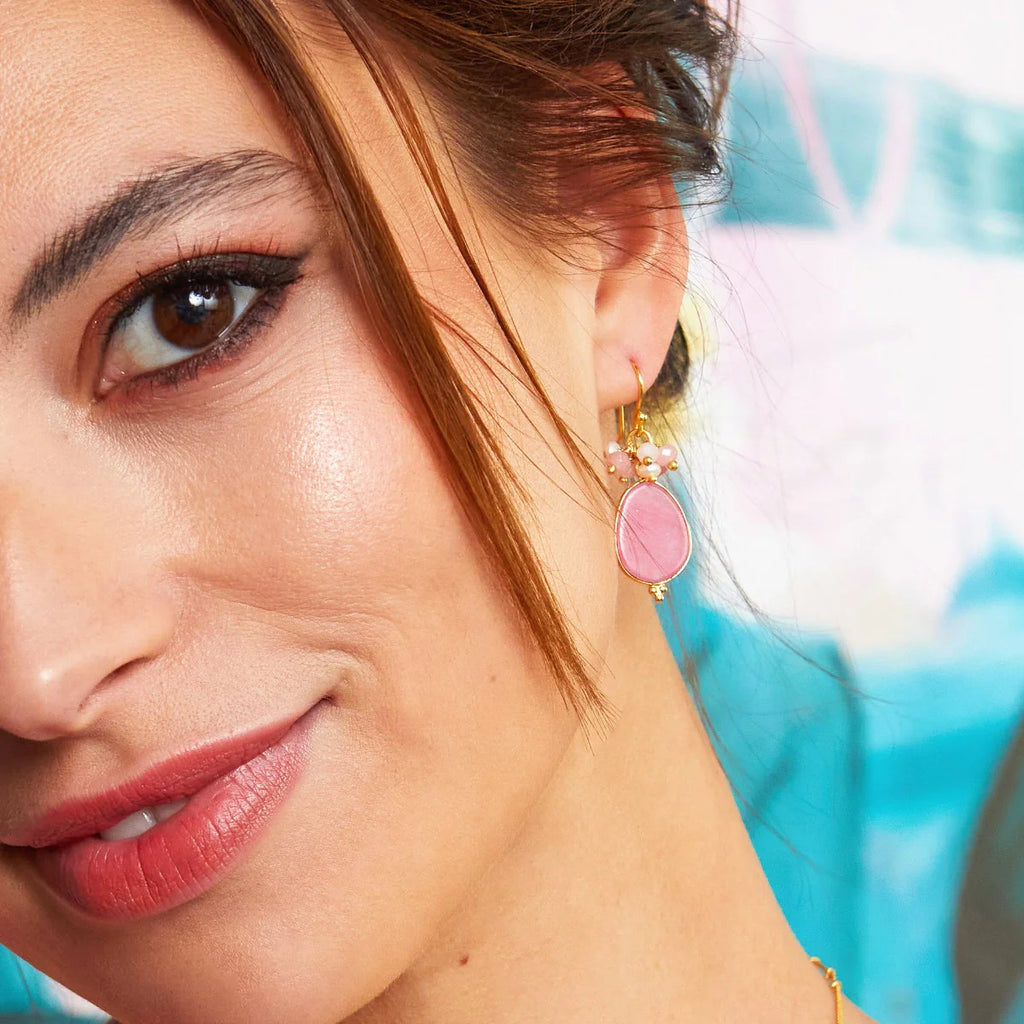 Drop pink jade earring with hand wired cluster of semi precious stones.