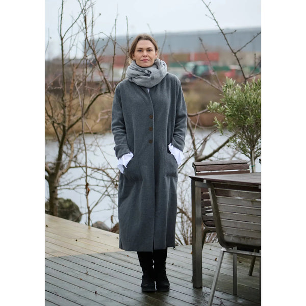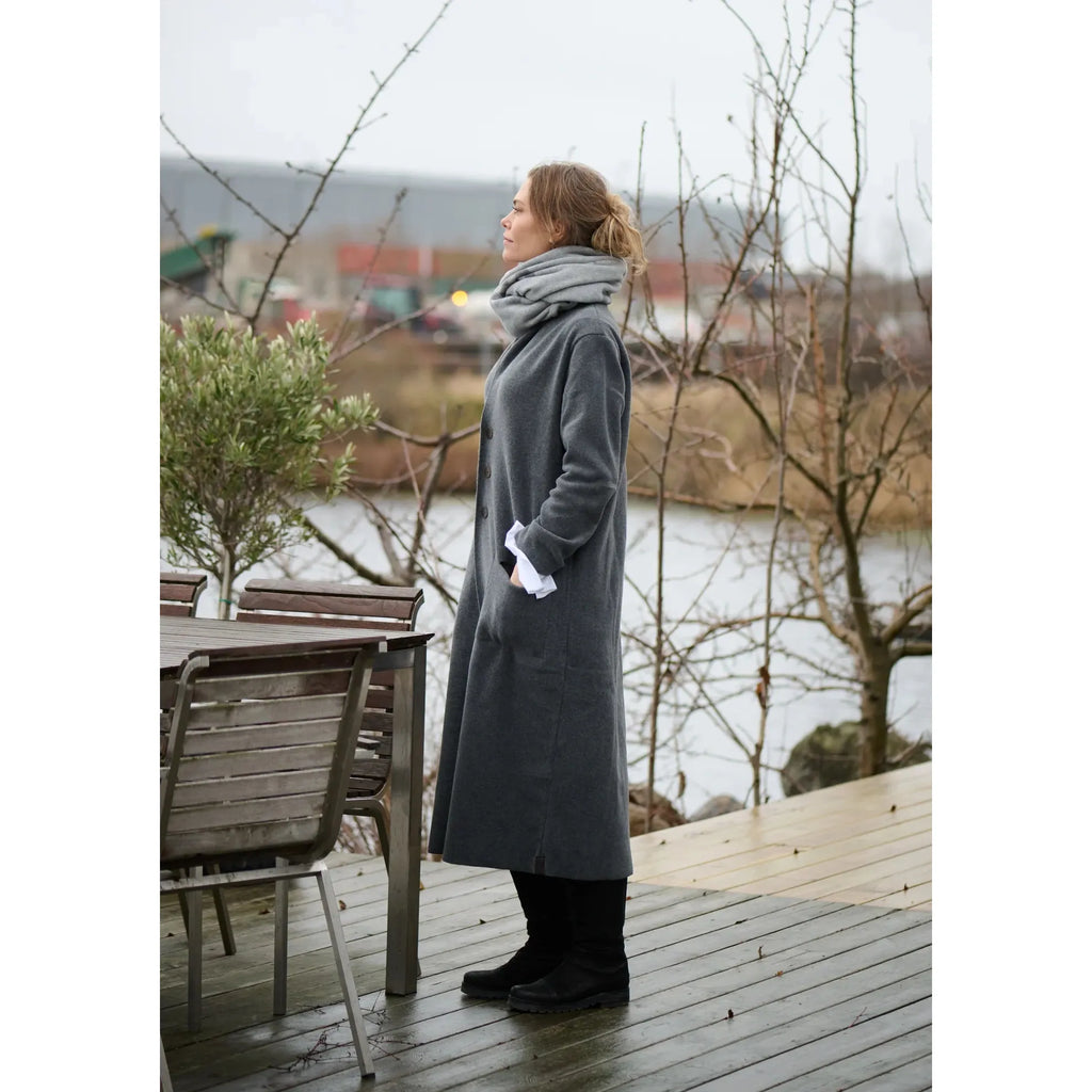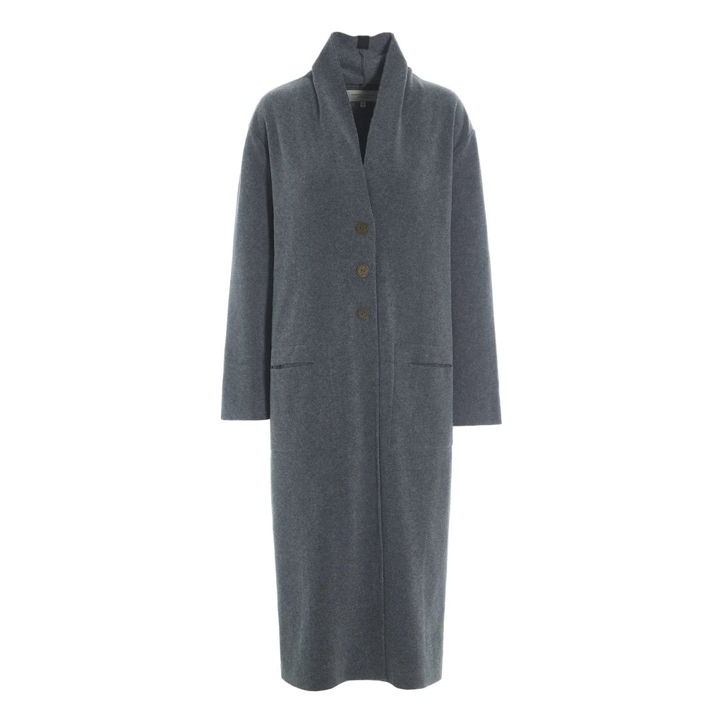 Long cardigan with large collar, pockets, and three brass buttons down the front.