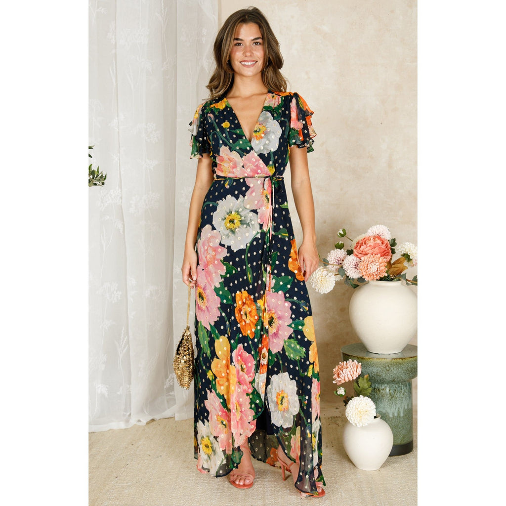 Fall head over heels in love with signature Hope & Ivy blooms in this flattering wrap style from our new summer collection. Woven with sparkling golden Lurex polka dots, this lightweight georgette style is printed with oversized poppies in pink, orange and ivory. With layered flutter sleeves, a plunging v-neckline, and tie waist details, this stunning silhouette is bound to turn heads this season.