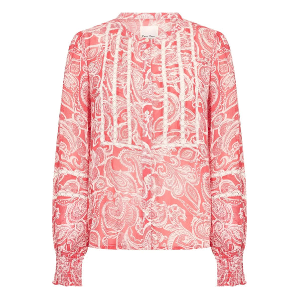 Crafted from light, airy viscose and featuring a delicate paisley print and lace inserts, this blouse is a versatile and stylish choice in red. The long sleeves are finished with shirred cuffs and lace details, while the round neckline and button up closure add a classic feel. Style for both casual and professional looks!
