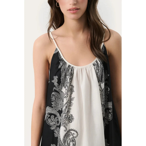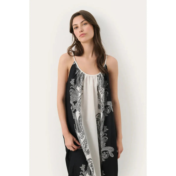A beautiful. feminine dress from Part Two with ¾ long sleeves, v-neck with a small collar at the neck and a wide ruffled edge at the bottom of the skirt.