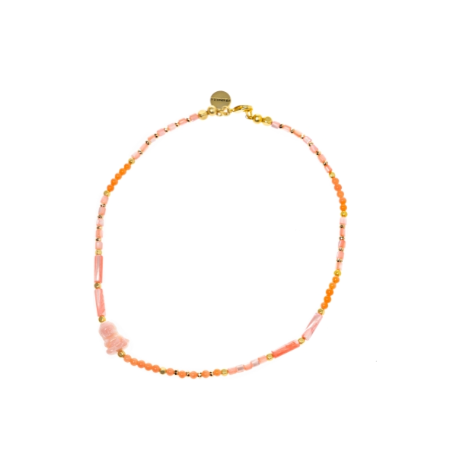 Pink and peach coloured beaded choker necklace with a small pink Buddha sitting horizontal on the neck. Gold lobster claw closure. wear on its own or layer with other necklaces