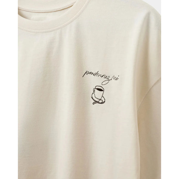 Designed with a print of a coffee cup on the chest and a graphic print on the back.
