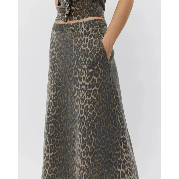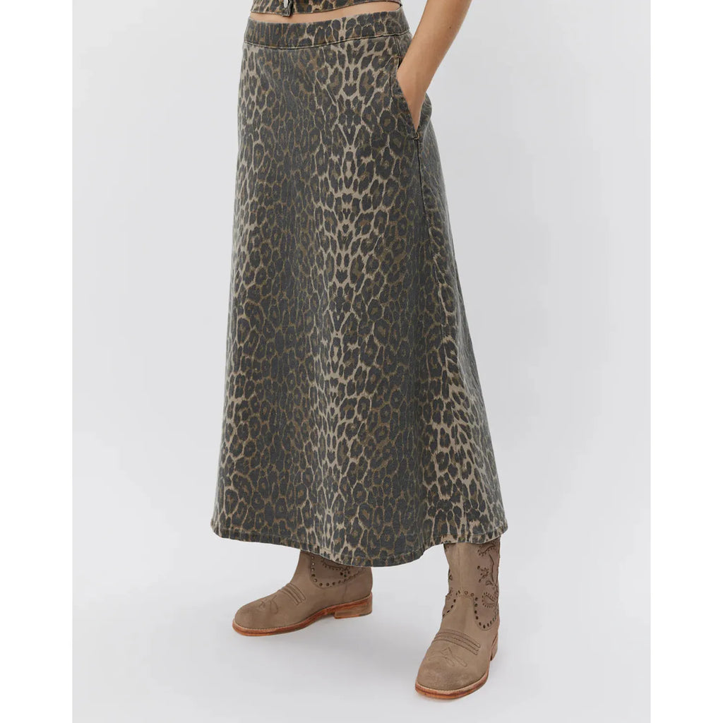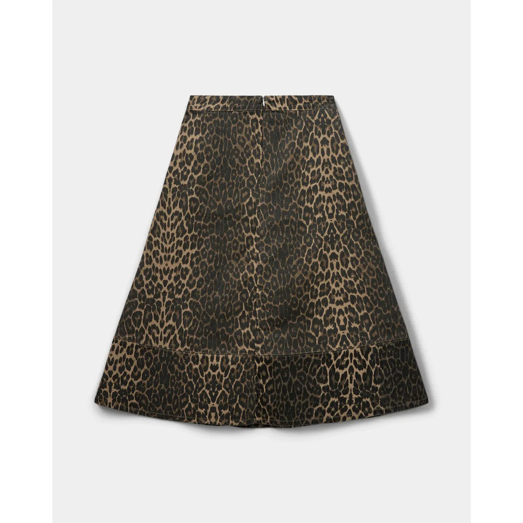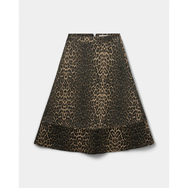 Skirt with leopard print. The skirt has an A-line silhouette, a hem at the bottom, and closes with a zipper at the back.