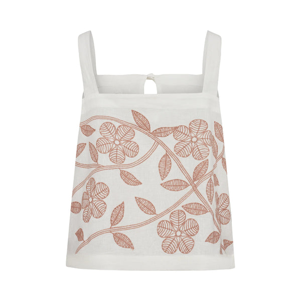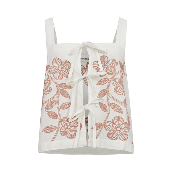 Sleeveless top with thick shoulder straps, the body sits square on the top with three bows down the centre, can be worn on its own or over a shirt to create a layered look.