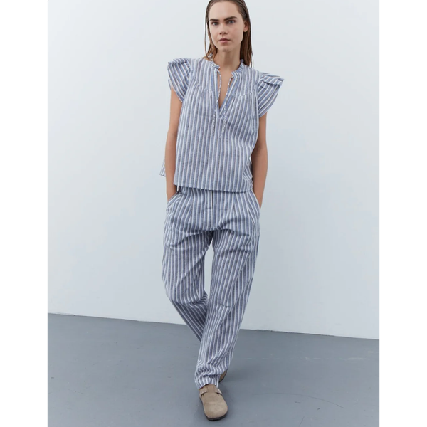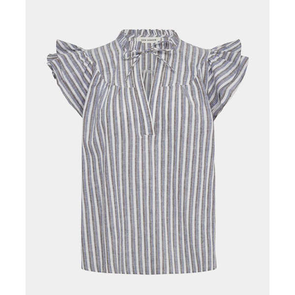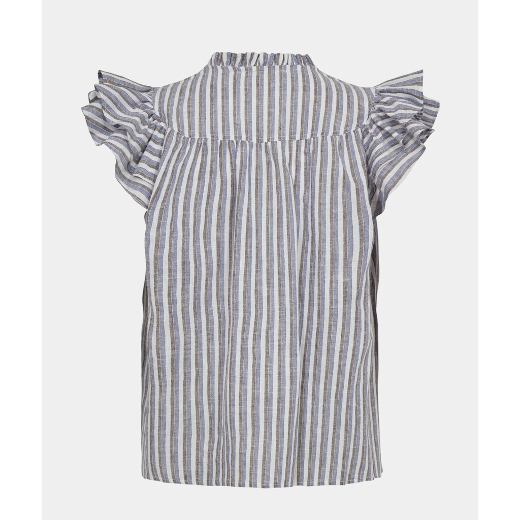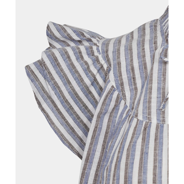 Blue striped top with ruffles on the shoulders. Designed with a V-neck and tie closure at the neck. Relaxed fit. 100% cotton.
