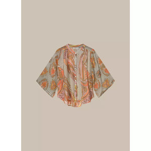 Wide bohemian blouse that combines different two prints, with a stand-up collar and wide sleeves. The bell sleeves accentuate your hips, meaning this blouse flatters the waistline.
