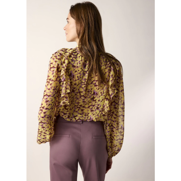 Featuring a blend of yellow and purple tones, this Summum Woman blouse boasts a delicate ruffle along the front and stylish balloon sleeves. The lightweight fabric is perfect for elevating any outfit, and this blouse can be effortlessly paired with jeans or a suit for a sophisticated look.
