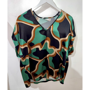 Short Sleeve Blouse with a unique green print. This smooth viscose blouse can be worn with the matching trousers or style up a pair of jeans or a plain skirt.