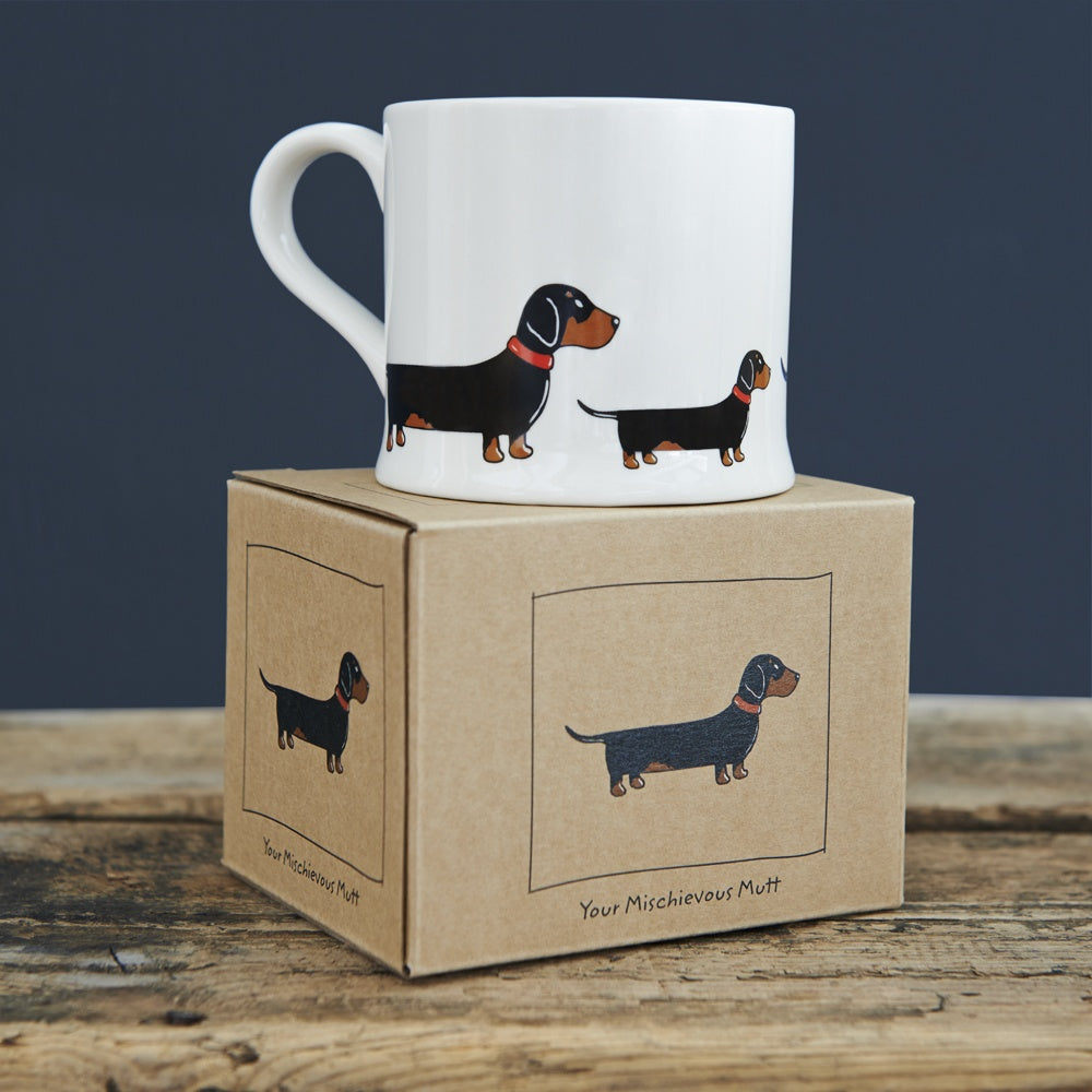 This adorable Dachshund / sausage dog mug features a repeat pattern of small and large Dachshunds all the way around the mug. The perfect present for all Dachshund / sausage dog lovers.