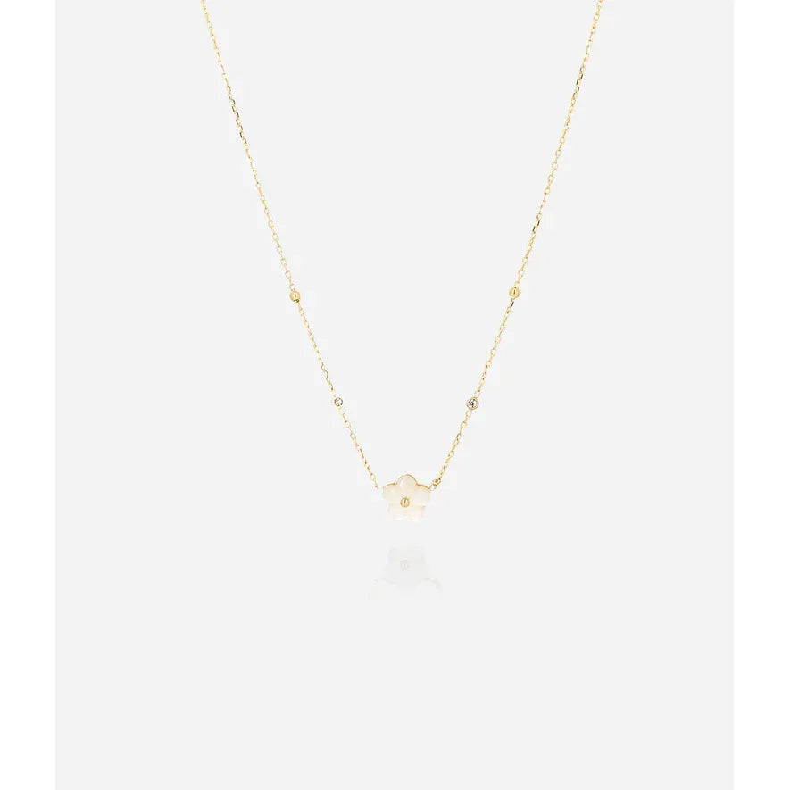 Gold-plated steel necklace with a small flower motif attached. Two small balls of golden steel and zirconiums are also on the chain.